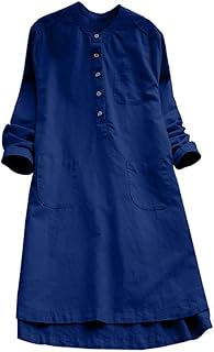 Lisusut ワンピース レディース 春夏秋 長袖 ドレス チュニック 無地 シンプル Aライン ボタンダウン ブラウス ポケット付き 膝丈 ゆったり 大人 着痩せ きれいめ 森ガール 体型カバー 女性 日常 リゾート 通勤 発表会 お呼ばれ 大きいサイズ
